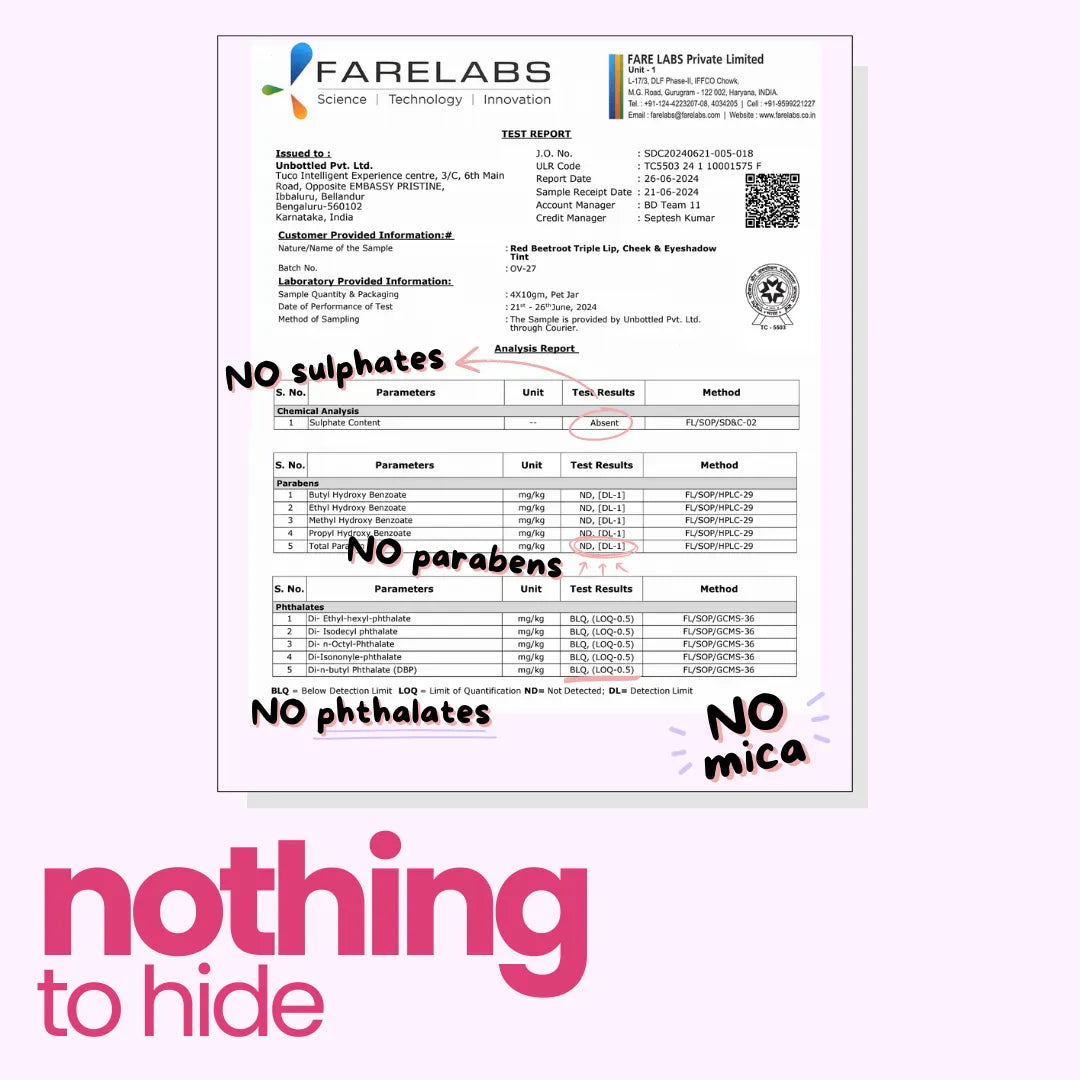Product type: Lip Tint Net quantity: 1 unit of 10 gms lip tint Shelf life: 24 months from the date of manufacturing Product dimensions (in cm): 2.5 x 2.5 x 2.5 Country of origin: India SKU code: 8908022401282 Batch number: OV-56 MRP(incl of all taxes): Rs 400 Manufactured by: Organovedics, 6/587, Puthur Rd, Koppam, Palakkad, Kerala 678001, LIC no: 03/32/13 Marketed by: Unbottle Private Limited, 76, 1st Floor, S R Enclave, 6th Cross, Kaggadasapura,BG Halli, Bangalore 560092, KN Consumer Care: / +919207245500, Email: support@theunbottle.com
