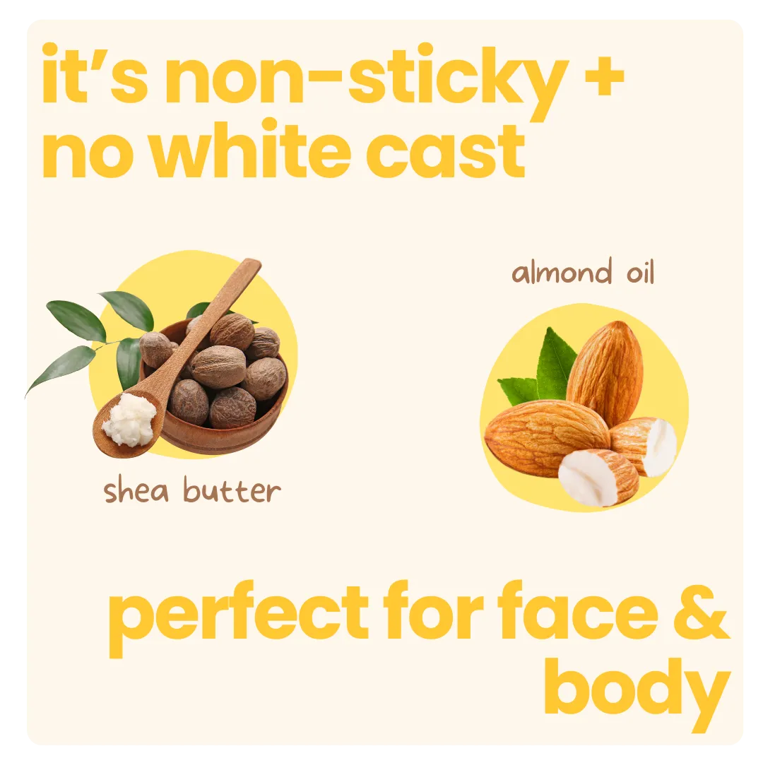 Mango Butter (Mangifera indica) is rich in vitamins A, C, and E, providing deep hydration while protecting kids' skin from UV damage and dryness. Its anti-inflammatory and antioxidant properties help soothe irritation, making it a gentle, nourishing addition to sunscreen for delicate skin.