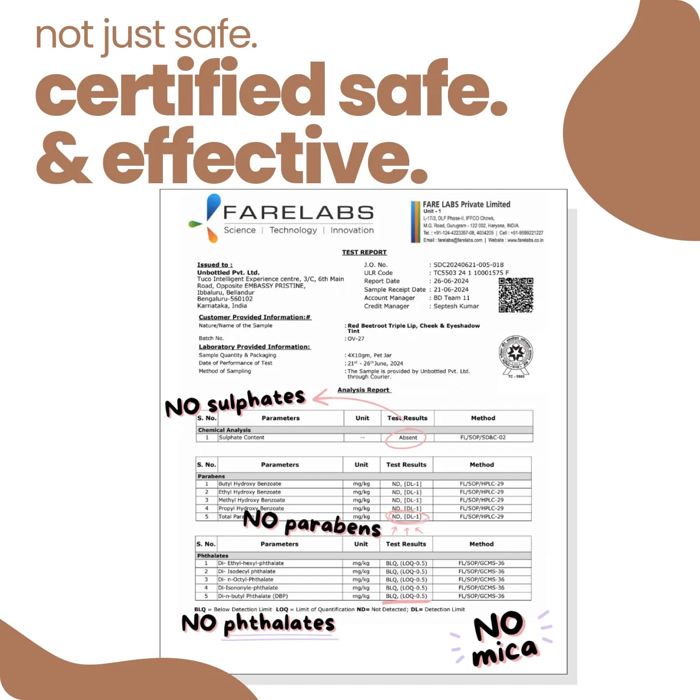 Product type: Lip Tint Net quantity: 1 unit of 10 gms lip tint Shelf life: 24 months from the date of manufacturing Product dimensions (in cm): 2.5 x 2.5 x 2.5 Country of origin: India SKU code: 8908022401572 Batch number: OV-57 MRP(incl of all taxes): Rs 400 Manufactured by: Organovedics, 6/587, Puthur Rd, Koppam, Palakkad, Kerala 678001, LIC no: 03/32/13 Marketed by: Unbottle Private Limited, 76, 1st Floor, S R Enclave, 6th Cross, Kaggadasapura,BG Halli, Bangalore 560092, KN Consumer Care: / +919207245500, Email: support@theunbottle.com