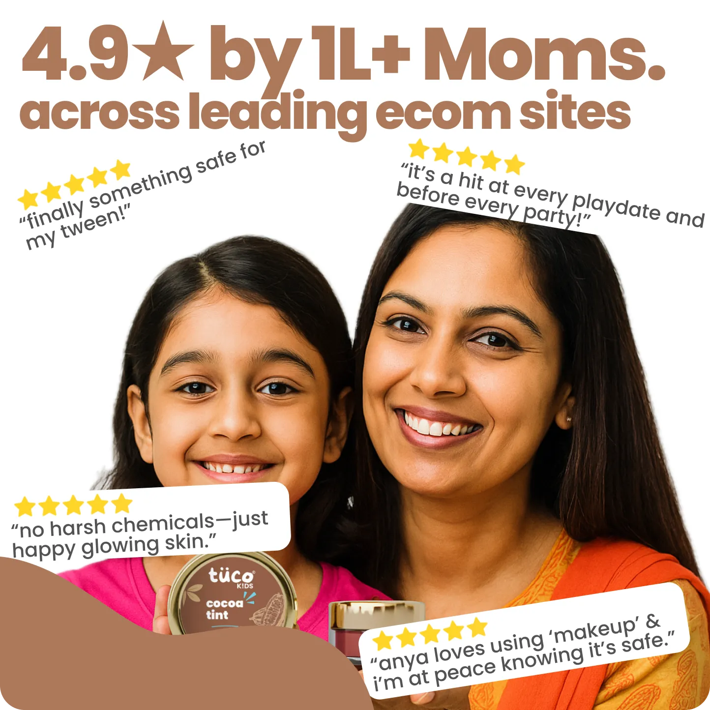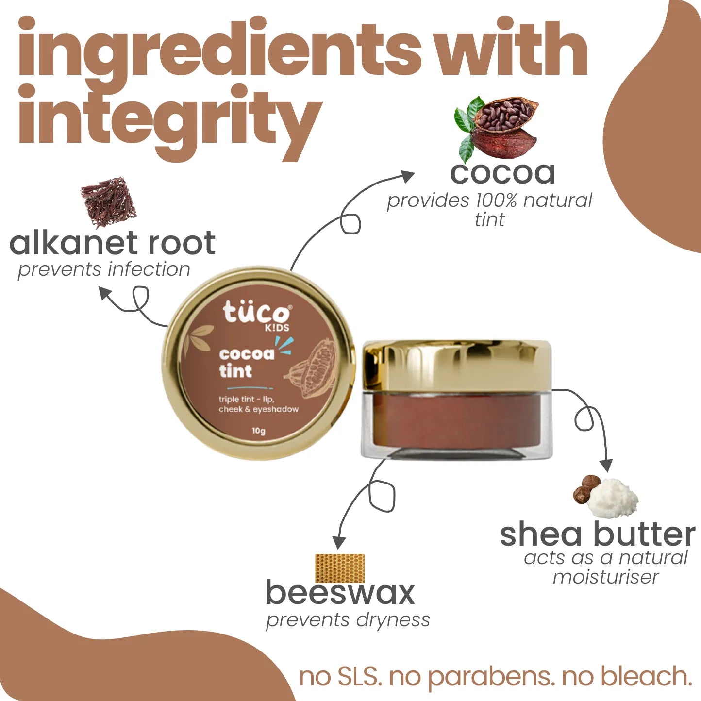 Absolutely, this 2-in-1 tint is 100% natural and safe to use on kids' lips and cheeks. It's formulated with organic cocoa powder, cocoa extract, shea butter, alkanet root powder, and beeswax, providing a natural and subtle tint while moisturizing and protecting the skin and lips.
