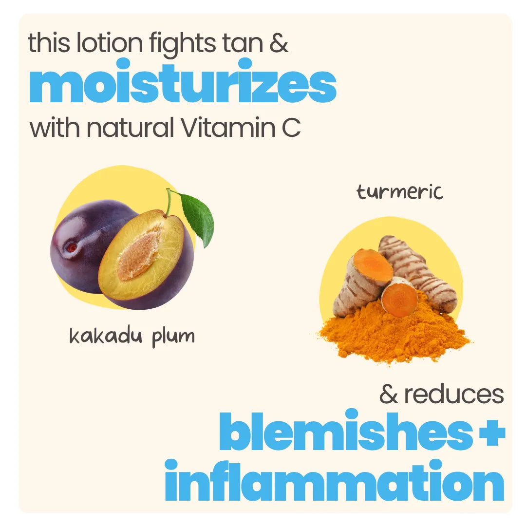 The lotion features Kakadu Plum for brightening, Shea Butter for hydration, and Turmeric to fight dullness and dark spots.