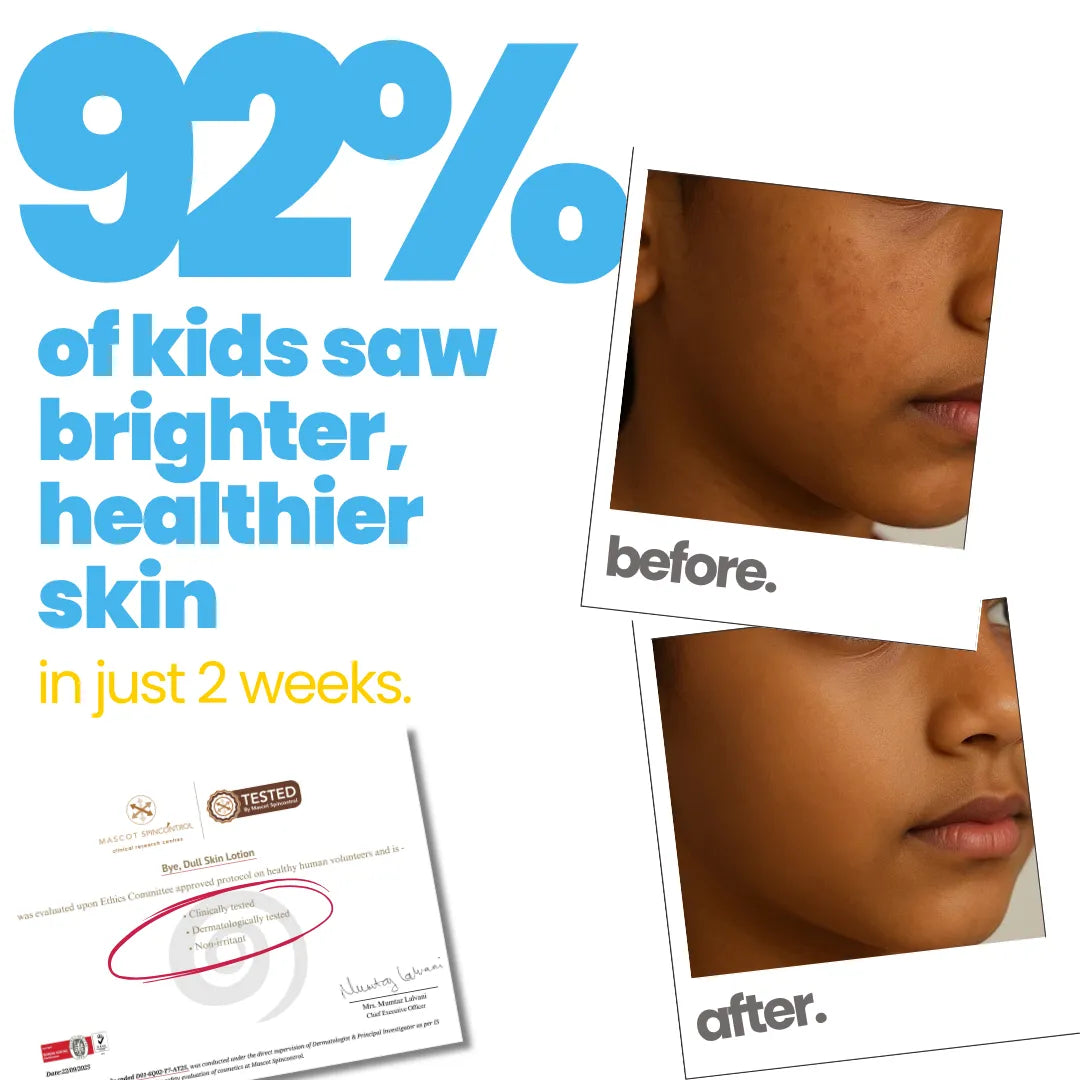 It’s a dull skin lotion for kids that brightens and hydrates, transforming dry, patchy skin into a smooth, glowing complexion.