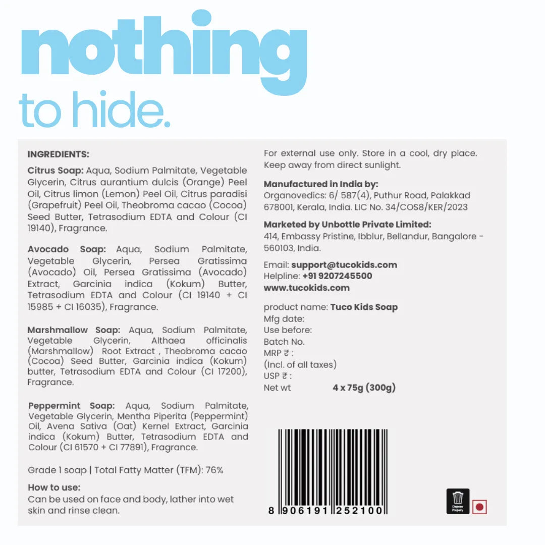 Product type: Tuco Kids Soap Net quantity: 4 x 75 grams Shelf life: 24 months from the date of manufacturing Product dimensions (in cm): Country of origin: India SKU code: 64585 8906191252100 MRP(incl of all taxes): Rs 400/- Manufactured by: Organovedics, 6/587(4), Puthur Road Palakkad 678001 Kerala, India. LIC No. 34/COS8/KER/2023 Marketed by: Unbottle Private Limited: 414, Embassy Pristine, Iblur, Bellandur, Bangalore - 560103, India. Consumer Care: / +919207245500, Email: support@theunbottle.com