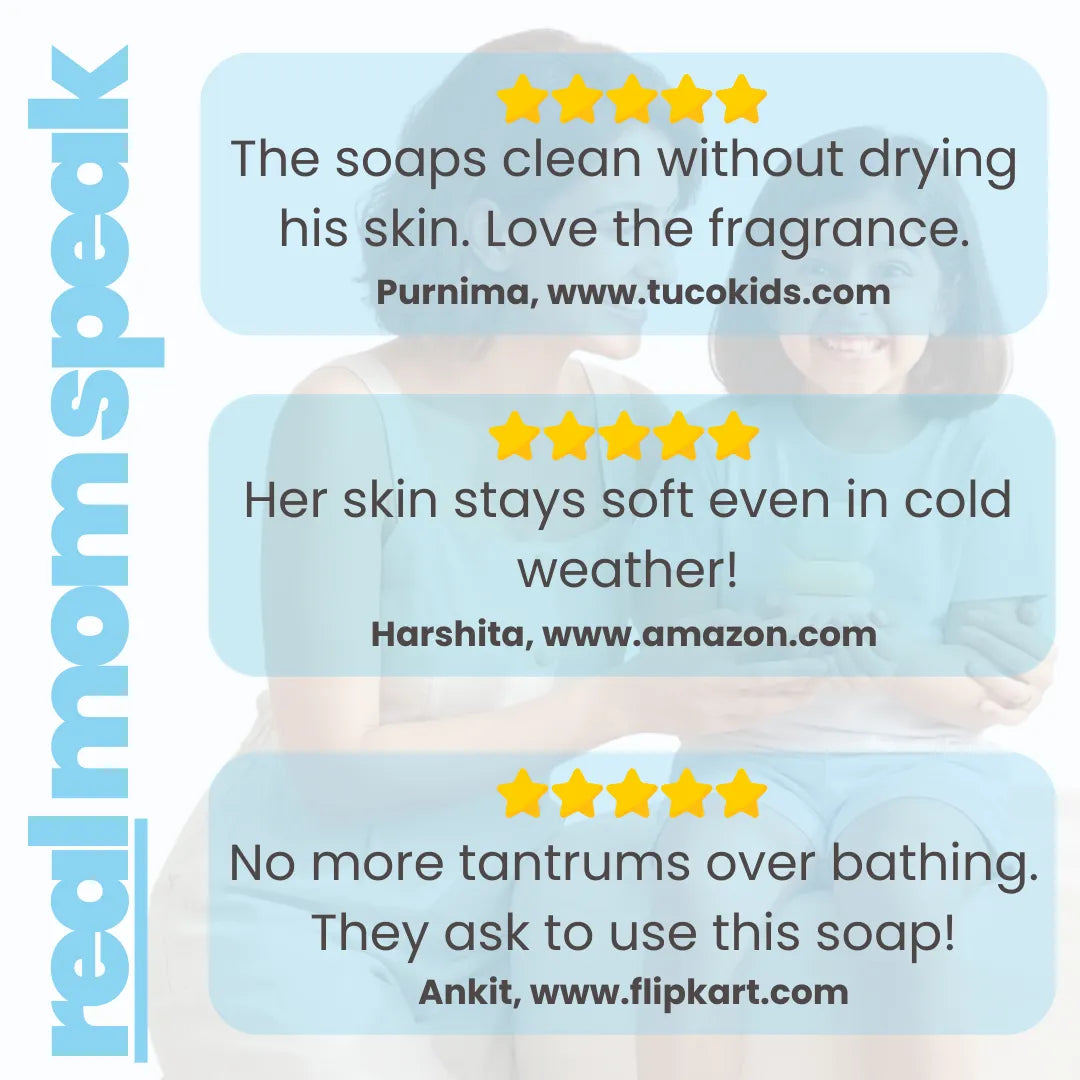 All four soaps—Citrus, Avocado, Marshmallow, and Peppermint—are gentle and suitable for all skin types, including delicate and sensitive kids’ skin.