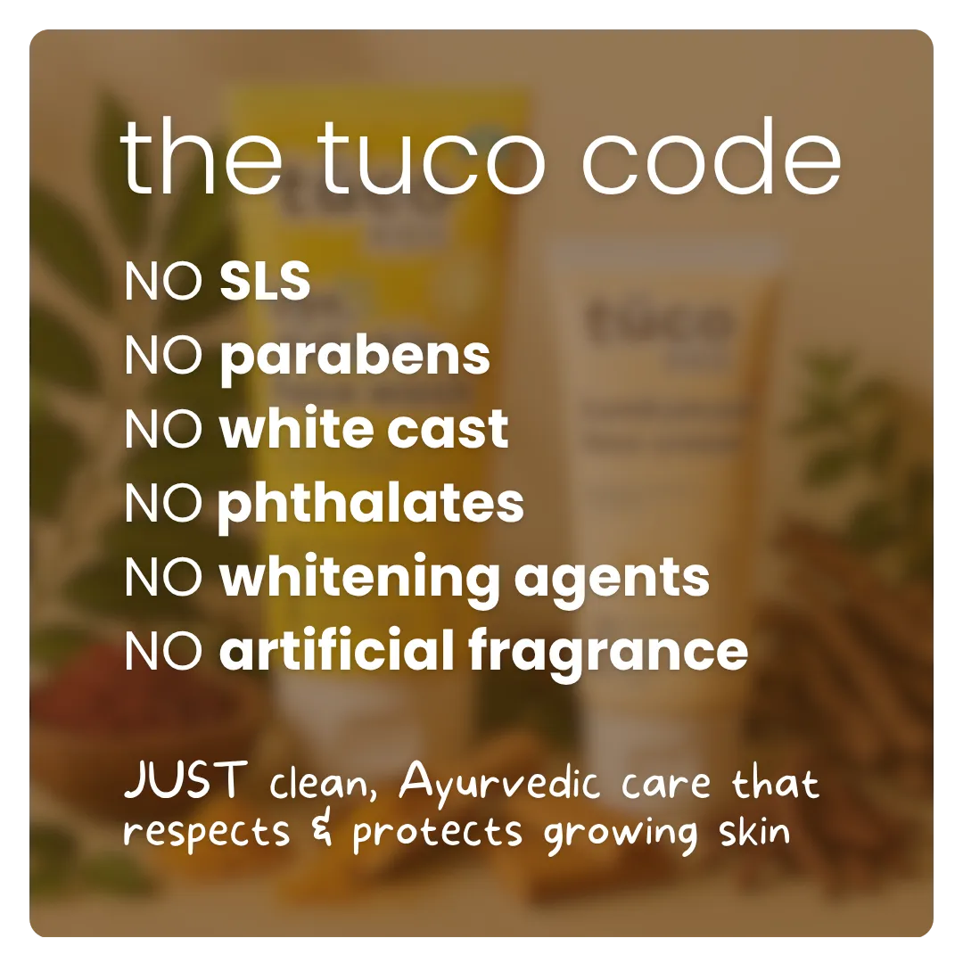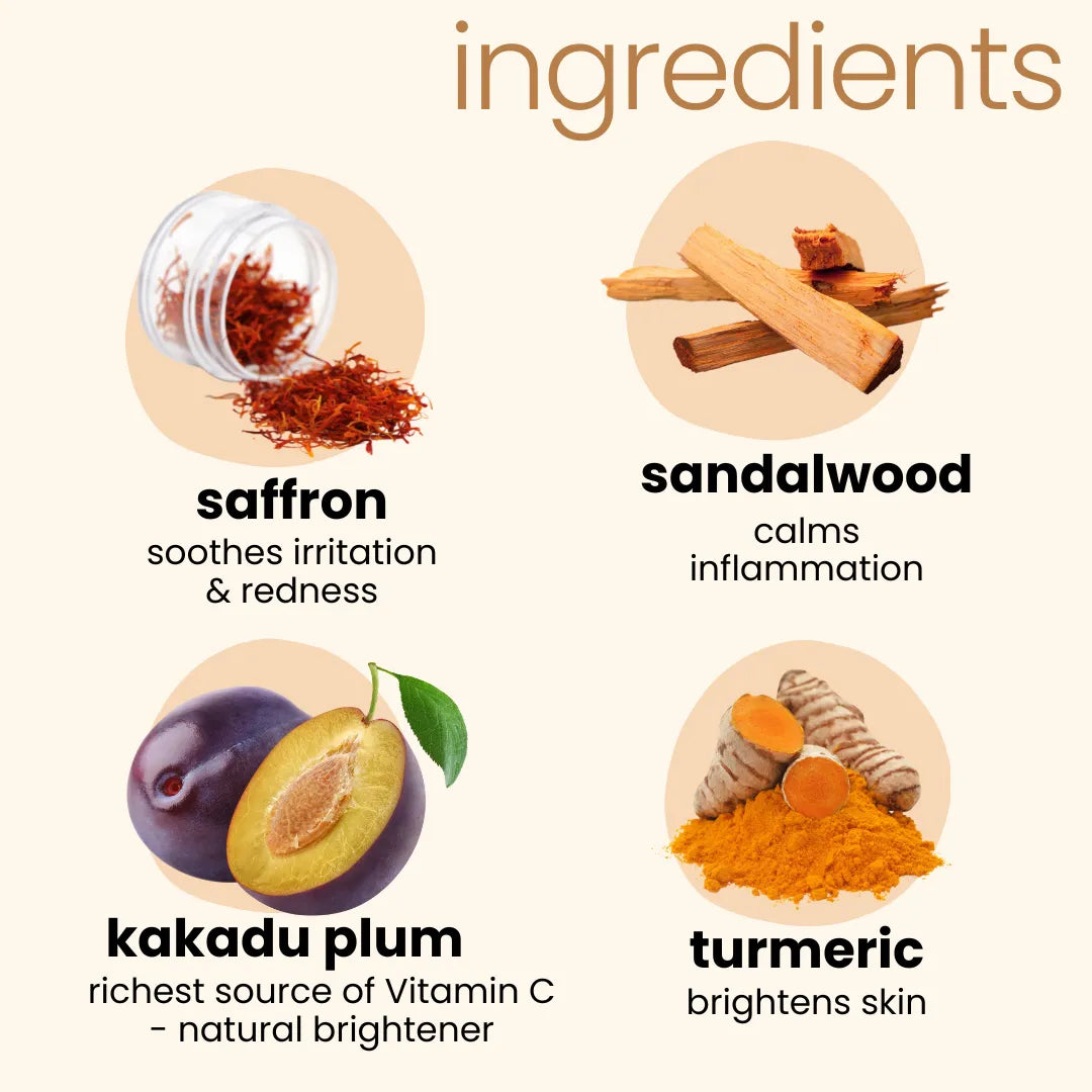 Hero ingredients include Kumkumadi, Red Sandalwood, Manjistha, and Haldi. It also contains goat milk, rose water, sesame oil, and a blend of traditional Ayurvedic extracts.