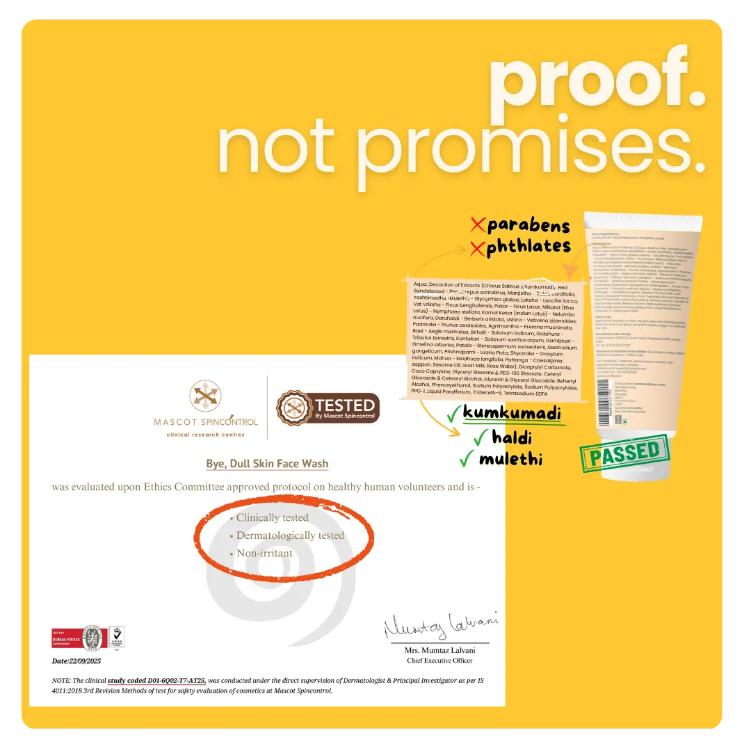 Product type: Kumkumadi Face Cream Net quantity: 50 grams Shelf life: 24 months from the date of manufacturing Product dimensions (in cm):   Country of origin: India SKU code:  64983 8906191251103 MRP(incl of all taxes): Rs 350/- Manufactured by: Organovedics, 6/587(4), Puthur Road Palakkad 678001 Kerala, India. LIC No. 34/COS8/KER/2023 Marketed by: Unbottle Private Limited: 414, Embassy Pristine, Iblur, Bellandur, Bangalore - 560103, India. Consumer Care: / +919207245500, Email: support@theunbottle.comProduct type: Dull skin face wash Net quantity: 100ml Shelf life: 24 months from the date of manufacturing  Product dimensions (in cm): 5.8*3.5*15. Country of origin: India  SKU code: 8908022401541 MRP(incl of all taxes): Rs 350 /- Manufactured by:  Organovedics, 587(4), Puthur Road Palakkad 678001 Kerala, India. LIC No. 34/COS8/KER/2023 Marketed by: Unbottle Private Limited: 414, Embassy Pristine, Iblur, Bellandur, Bangalore - 560103, India. Consumer Care: / +919207245500, Email: support@theunbottle.com