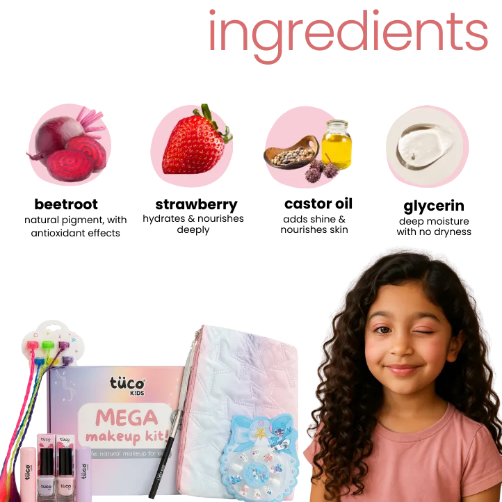 The Tuco Glam Makeup Box is the natural makeup kit designed for kids’ delicate skin. It’s safe, gentle, and perfect for beginners exploring step by step make up routines.