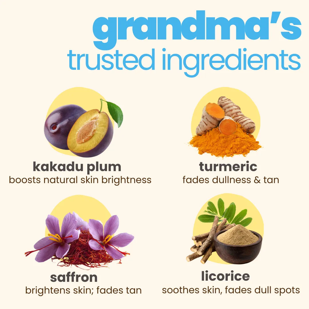 Step 1: Dull Skin Face Wash – Tear & sulphate-free cleanser with Kakadu Plum and Turmeric to deeply cleanse without stripping natural oils Step 3: SPF 30 Sunscreen – Lightweight, broad-spectrum protection with a matte finish.