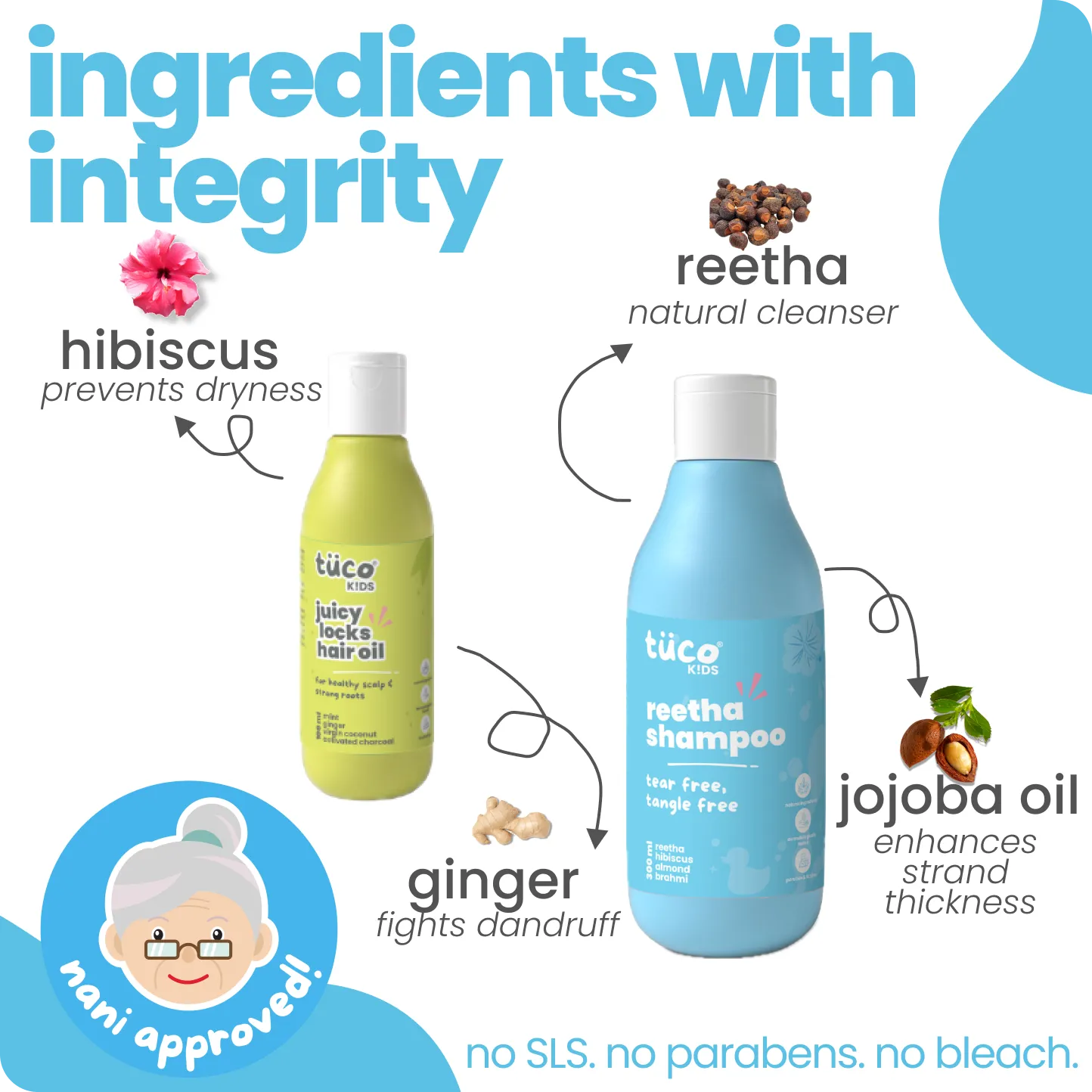 The Kiddy Juicy Locks Duo is designed for kids aged 3-15 years, providing gentle yet effective care for delicate hair and scalp.