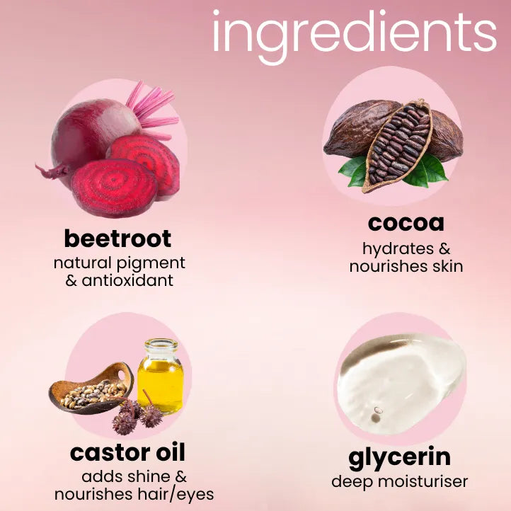Nailed it- Aqua, Styrene/Acrylates Copolymer, Schedule q colors, Xanthan Gum, Glycerine, Propylene Glycol, Phenoxyethanol and Ethylhexlglycerine. Cocoa Lip Tint- Beeswax, Cocoa Seed, Butter, Olive Oil, Sweet Almond Oil, Shea Butter, Wheat Germ Oil, Butter Extract, Natural, Vitamin E, Cocoa Extract, Aloe vera Extract. Beetroot Lip Tint- Theobroma cacao (Cocoa) Seed Butter, Olea europaea (Olive) Fruit Oil, Prunus amygdalus Dulcis (Sweet Almond) Oil, Shea (Vitellaria paradoxa) Butter, Triticum vulgare (Wheat Germ) Oil, Beeswax (Cera alba), Butter Extract, Beta vulgaris (Beet Root) Powder, Aloe barbadensis (Aloe Vera) Extract, Natural Vitamin E (Natural Mixed Tocopherol), Butylated hydroxytoluene (BHT). Kiddy Kohl Kajal- Ricinus Communis Seed (Castor) Oil, Caprylic/capric triglycerides, Isopropyl myristate, Natural Carbon black, Beeswax (Cera alba), Euphorbia Cerifera Cera (candelilla wax), Prunus Amygdalus (Almond) Dulcis Oil, Pentaerythrityl Tetra-di-t-butyl Hydroxyhydrocinnamate, May contain: D&C Black No.2 (CI 77266), Iron Oxide Black (CI 77499)